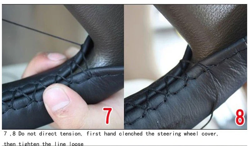 Заготовка оплётки имеет прострочку по краю. При стягивании краёв на руле нить пропускают в стежки.