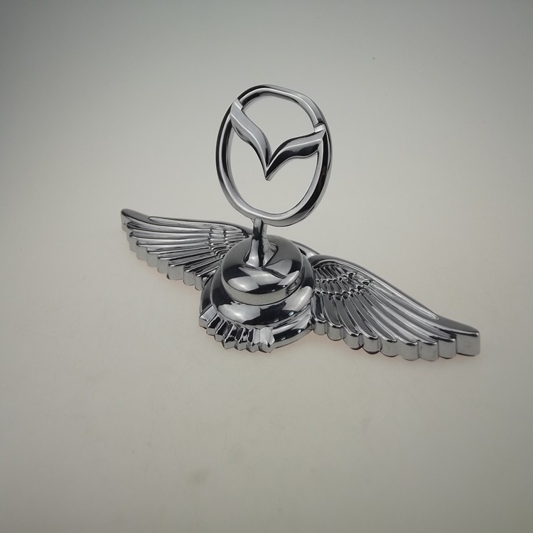 Это японская марка машины с крыльями на значке, образованными средней частью стилизованной буквы «М», внешние края которой немного закрывают контуры круга. Начертание логотипа часто изменялось, поскольку основатели компании старались как можно точнее выразить в значке крылья, свет и солнце. В современном символе, отражающем гибкость, нежность, творчество и ощущение комфорта, можно рассмотреть одновременно и птицу, летящую на фоне небесного светила, и голову совы.